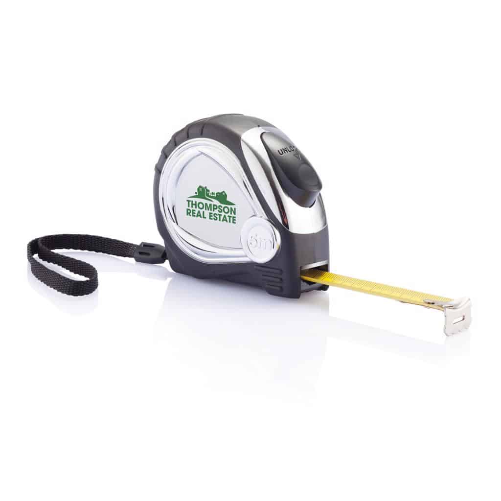 Kromirano merilo z gumiranim oprijemom in rumenim trakom. Sponka za pas in trak za zapestje. Odlično orodje za promocijo.