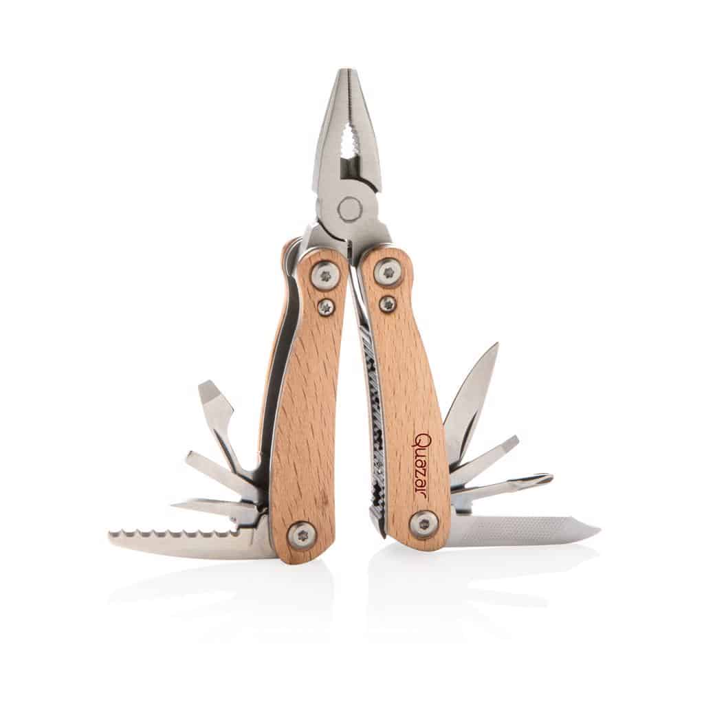 Večnamensko nerjaveče orodje z lesenim ohišjem. 12 funkcij: dvoje klešče, rezalnik žice, nazobčano rezilo, odpirač, dva noža, štirje izvijači, pilica, čistilo.