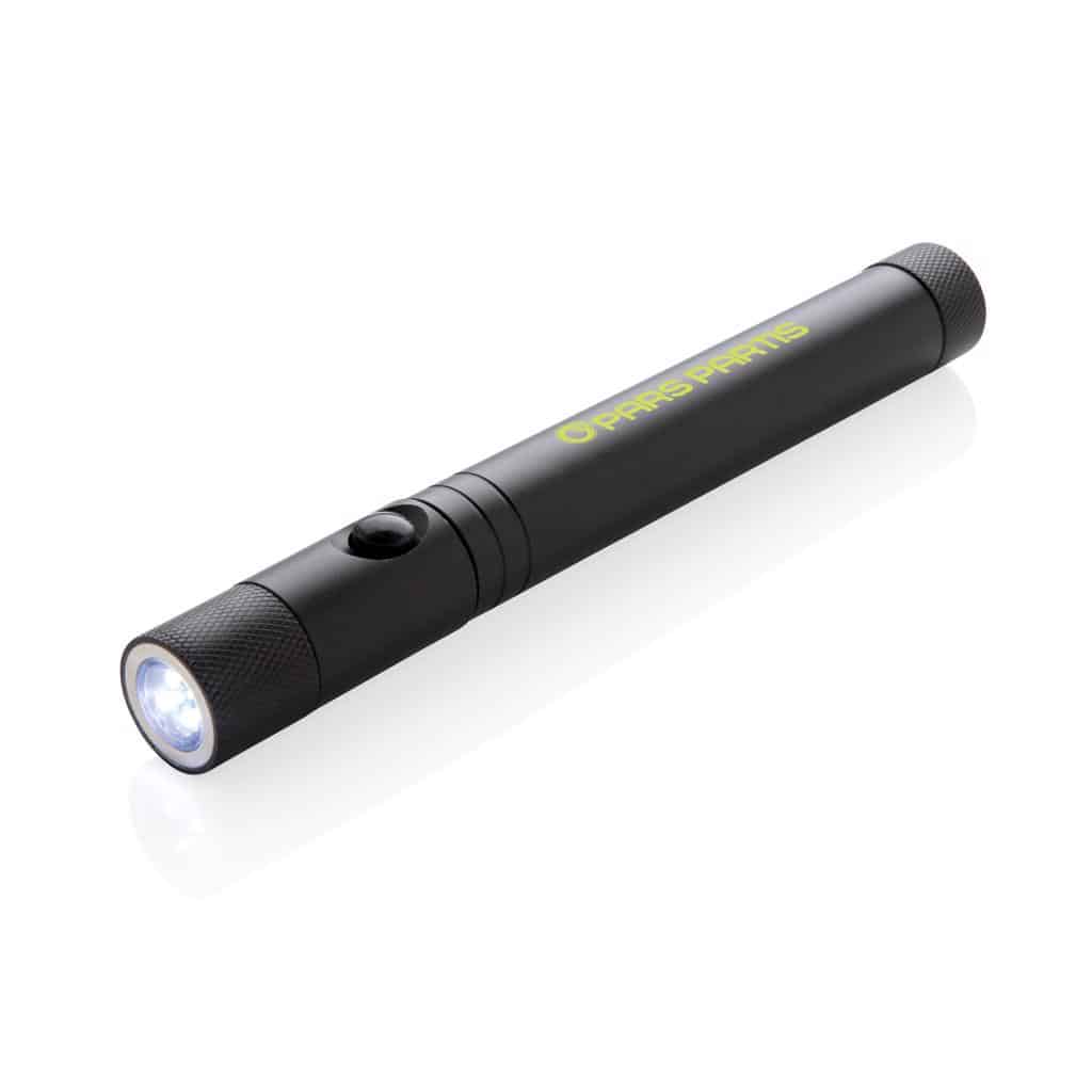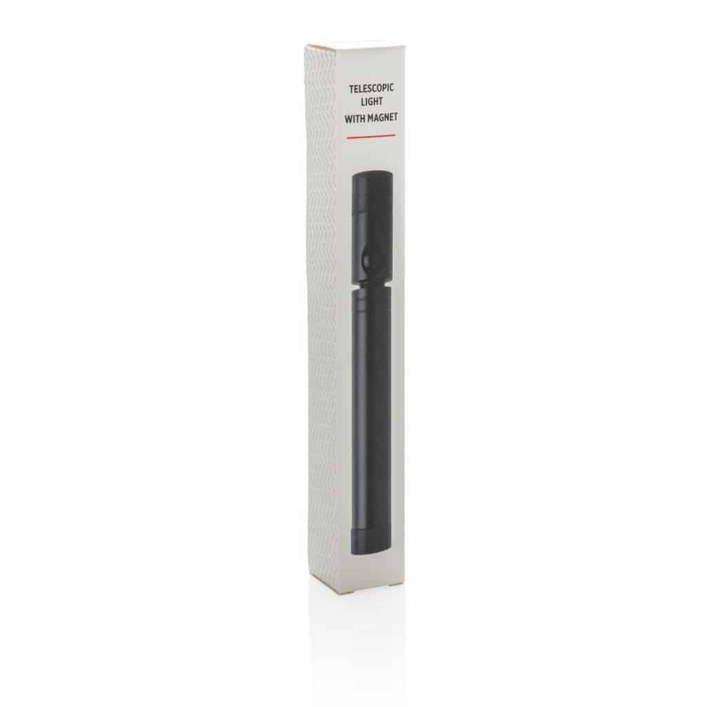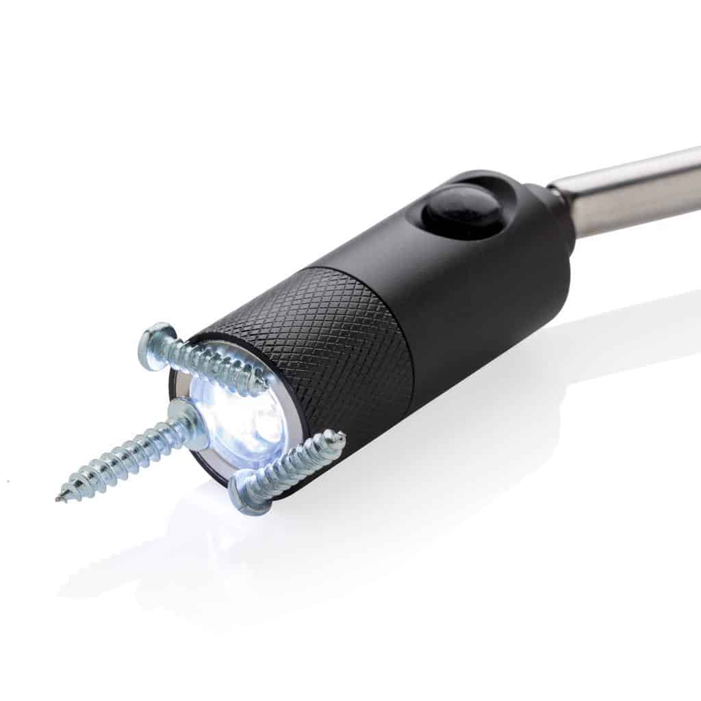 Večnamenska LED delovna svetilka iz aluminija z dvojno magnetno osnovo za pritrditev na kovinske površine. Raztegljiva z dolžine 17 cm na 58 cm, z magnetom na koncu za pobiranje težko dostopnih predmetov. Glava svetilke je prilagodljiva v vse smeri. Vgrajene tri močne LED diode. Vključuje baterije za takojšnjo uporabo.